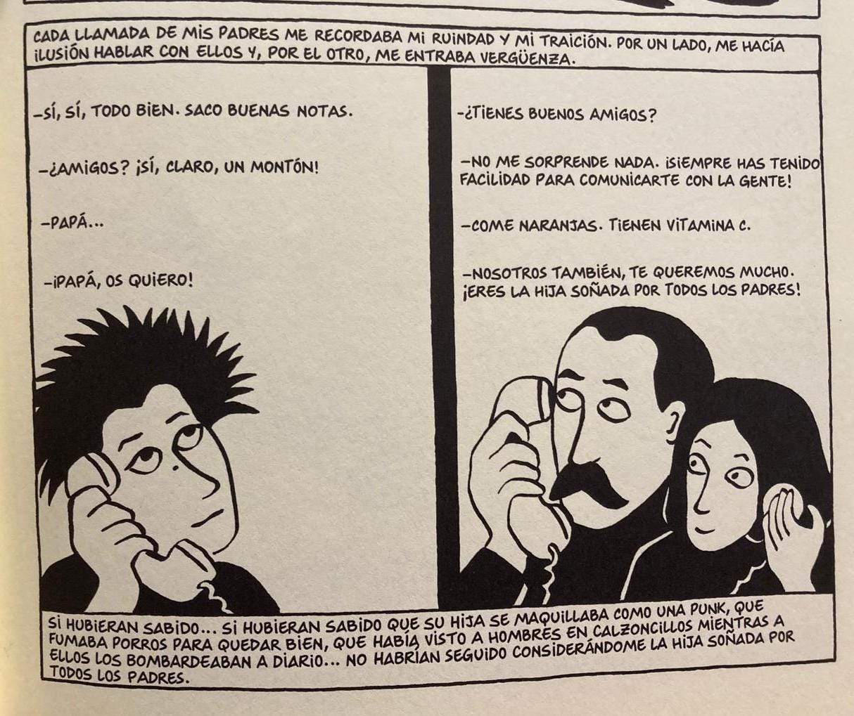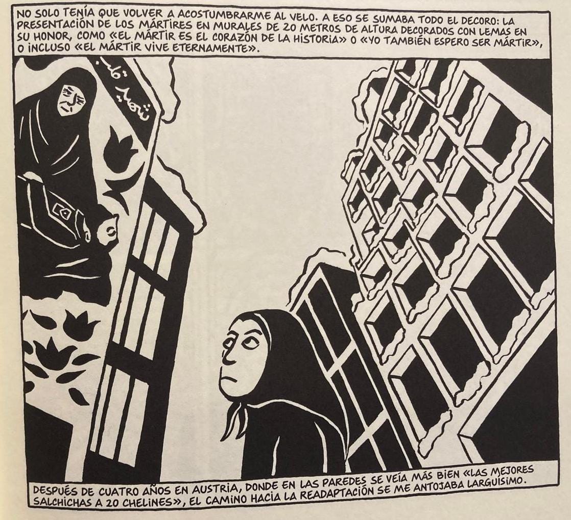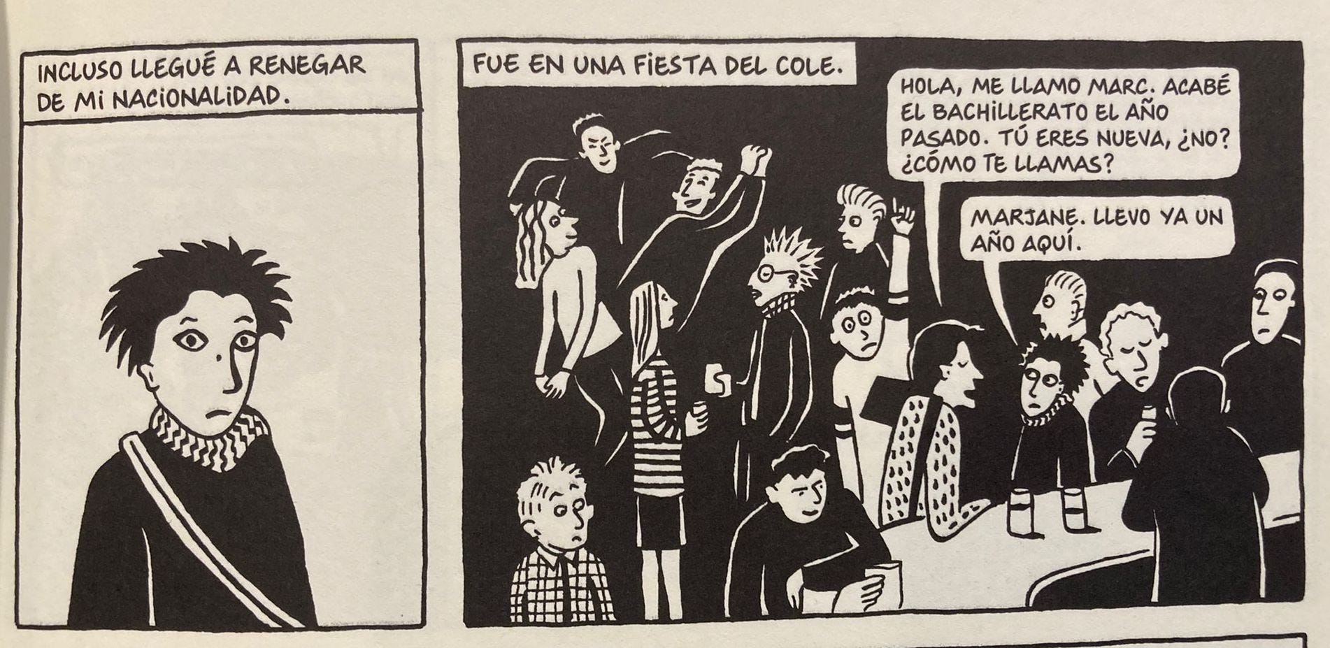Marjane emigra durante su adolescencia, en un momento en que su país, Irán, está inmerso en una guerra. Mientras sus seres queridos viven bajo constantes bombardeos, ella atraviesa los conflictos propios de esta etapa vital en un entorno seguro. Esta situación le genera un sentimiento de culpa, al percibir sus preocupaciones como insignificantes frente al sufrimiento de su familia. Al mismo tiempo, la adopción de costumbres del país de acogida, muchas de ellas en conflicto con su cultura de origen, despierta en ella una sensación de vergüenza y la idea de estar traicionando a los suyos.
